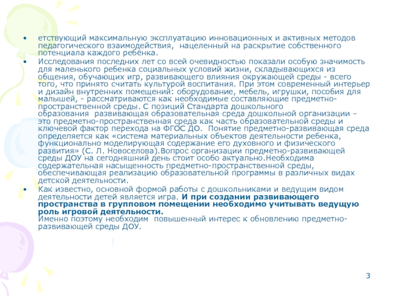 Исследования последних лет со всей очевидностью показали особую значимость для маленького ребенка социальных условий жизни, складывающихся из общения, обучающих игр, развивающего влияния окружающей среды - всего того, что принято считать культурой воспитания. При этом современный интерьер и дизайн внутренних помещений: оборудование, мебель, игрушки, пособия для малышей, - рассматриваются как необходимые составляющие предметно-пространственной среды. С позиций Стандарта дошкольного образования развивающая образовательная среда дошкольной организации – это предметно-пространственная среда как часть образовательной среды и ключевой фактор перехода на ФГОС ДО. Понятие предметно-развивающая среда определяется как «система материальных объектов деятельности ребенка, функционально моделирующая содержание его духовного и физического развития» (С. Л. Новоселова).Вопрос организации предметно-развивающей среды ДОУ на сегодняшний день стоит особо актуально.Необходима содержательная насыщенность предметно-пространственной среды, обеспечивающая реализацию образовательной программы в различных видах детской деятельности.