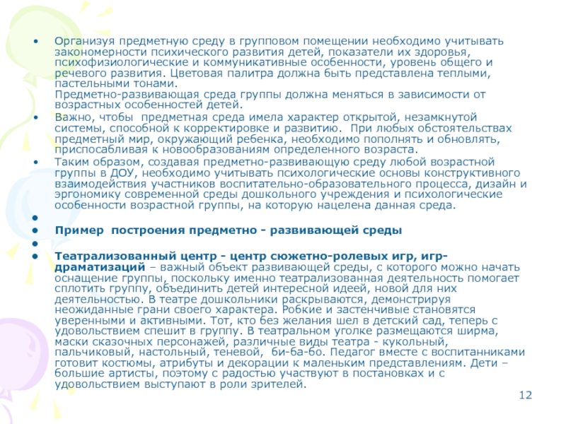 Слайд 12Организуя предметную среду в групповом помещении необходимо учитывать закономерности психического развития