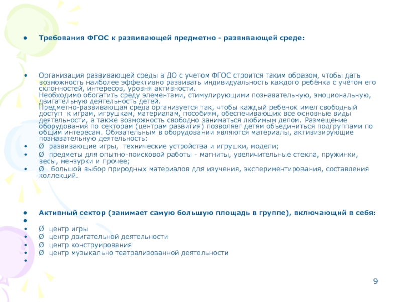 Слайд 9Требования ФГОС к развивающей предметно - развивающей среде:
