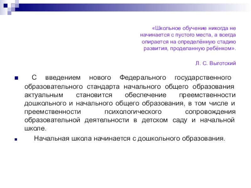 С введением нового Федерального государственного образовательного стандарта начального общего образования актуальным становится обеспечение преемственности дошкольного и начального общего образования, в том числе и преемственности психологического сопровождения образовательной деятельности в детском саду и начальной школе.