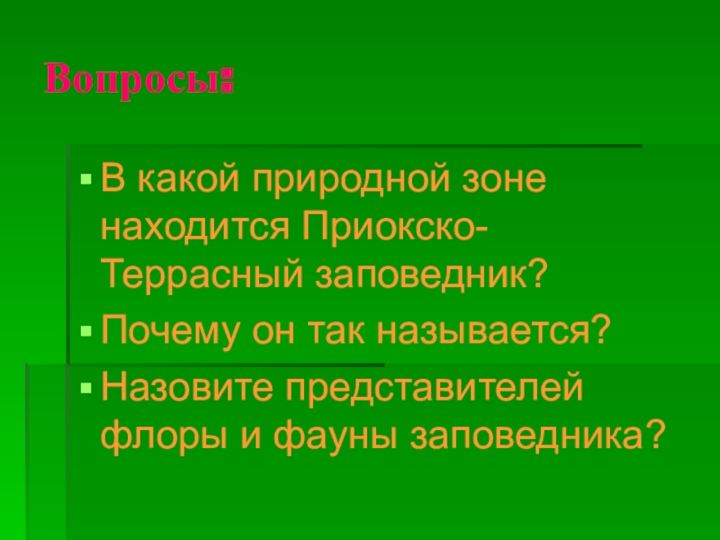 Вопросы:В какой природной зоне находится Приокско-Террасный заповедник?Почему он так называется?Назовите представителей флоры и фауны заповедника?