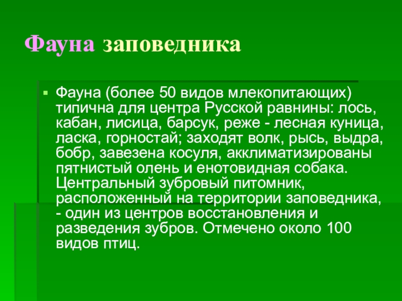 Фауна заповедникаФауна (более 50 видов млекопитающих) типична для центра Русской равнины: лось, кабан, лисица, барсук, реже -