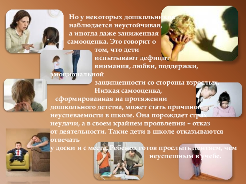 Часто мы можем услышать от дошкольника: «я самый сильный в группе», «мой рисунок самый лучший» и т.п. Для дошкольников характерна необъективно высокая оценка себя и своих способностей. Это происходит не от избытка самоуверенности и зазнайства, а является особенностью детского самосознания. Не нужно бороться с завышенной самооценкой и раньше времени добиваться ее адекватности. Это должно пройти само собой как результат прохождения ребенком кризиса 7 лет.