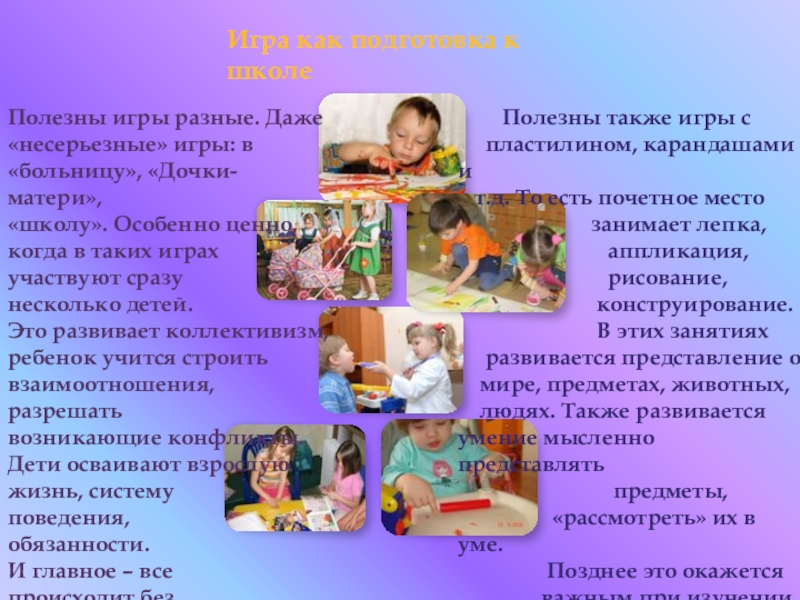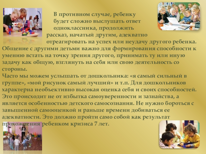Общение с другими детьми важно для формирования способности к умению встать на точку зрения другого, принимать ту или иную задачу как общую, взглянуть на себя или свою деятельность со стороны.