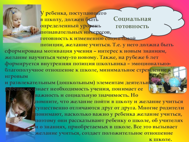 позиции, желание учиться. Т.е. у него должна быть сформирована мотивация учения – интерес к новым знаниям, желание научиться чему-то новому. Также, на рубеже 6 лет формируется внутренняя позиция школьника – эмоционально-благополучное отношение к школе, минимальное стремление к игровым