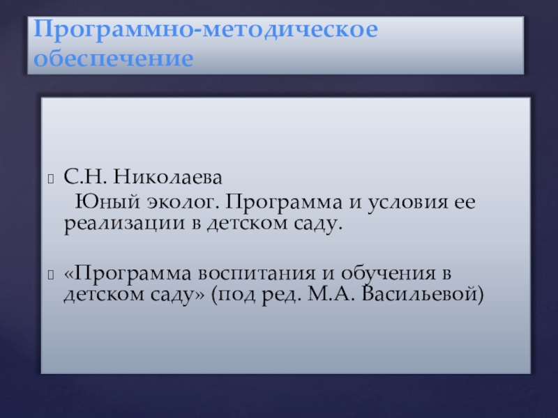 Программно-методическое обеспечениеС.Н. Николаева Юный эколог. Программа и условия ее реализации в детском саду.«Программа воспитания и обучения в детском саду» (под ред. М.А. Васильевой)