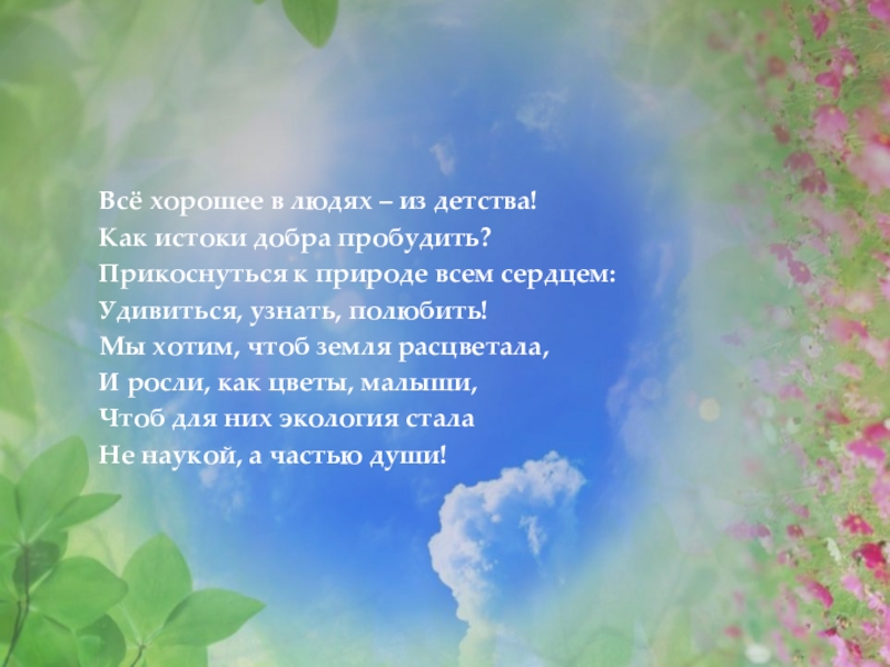 Всё хорошее в людях – из детства!Как истоки добра пробудить?Прикоснуться к природе всем сердцем:Удивиться, узнать, полюбить!Мы хотим,