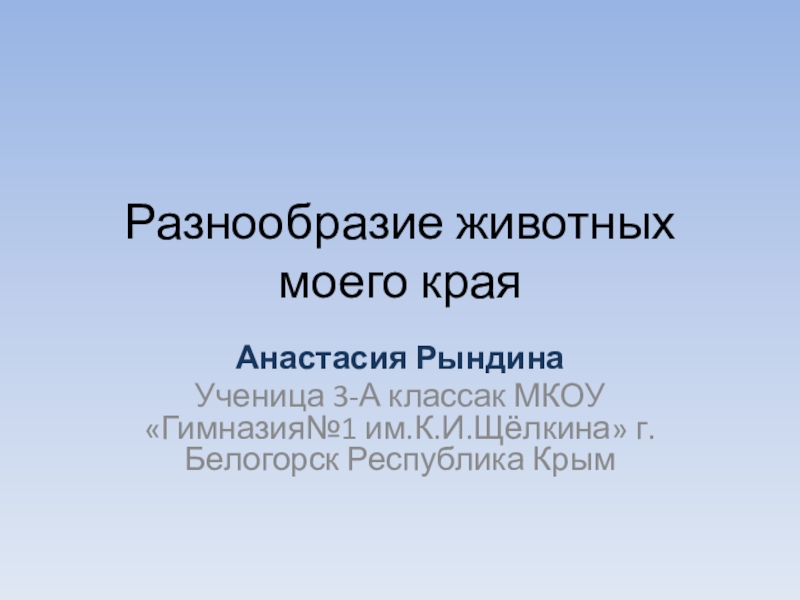 Разнообразие животных моего краяАнастасия РындинаУченица 3-А классак МКОУ «Гимназия№1 им.К.И.Щёлкина» г.Белогорск Республика Крым