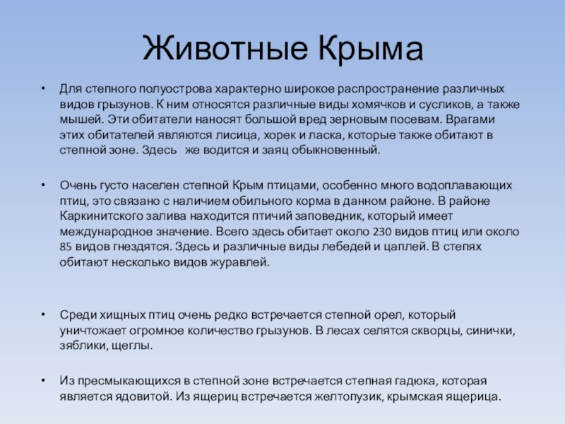 Животные КрымаДля степного полуострова характерно широкое распространение различных видов грызунов. К ним относятся различные виды хомячков и
