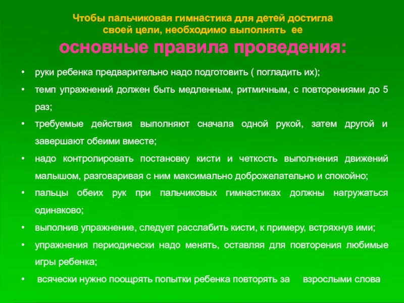 Эти правила должны соблюдаться при проведении пальчиковой гимнастики с детьми любого возраста.