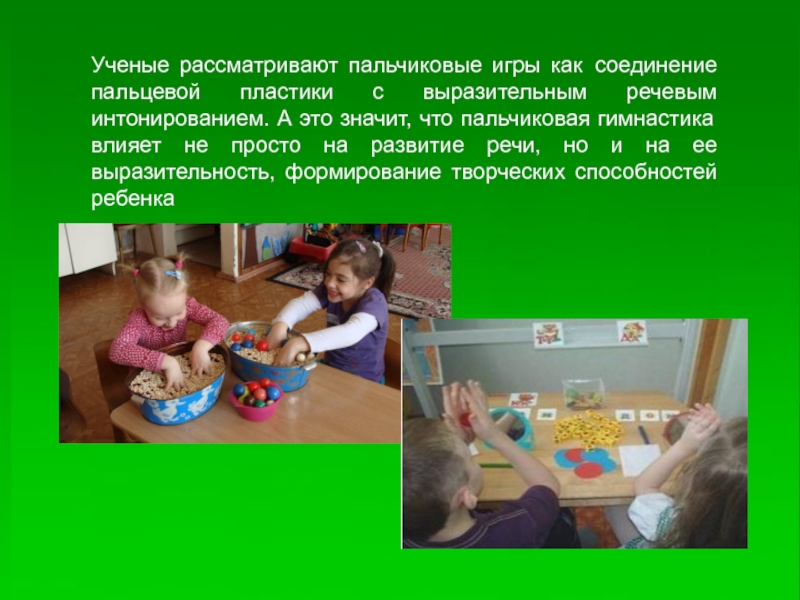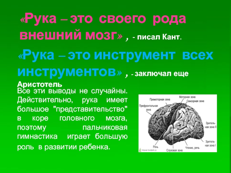 Все эти выводы не случайны. Действительно, рука имеет большое "представительство" в коре головного мозга, поэтому пальчиковая гимнастика играет большую роль в развитии ребенка.