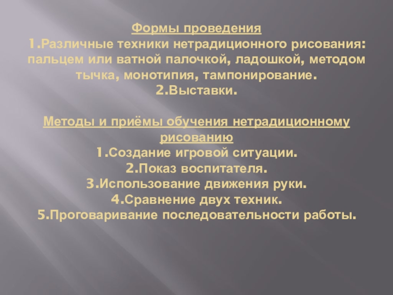 Слайд 5Формы проведения 1.Различные техники нетрадиционного рисования: пальцем или ватной палочкой, ладошкой, методом