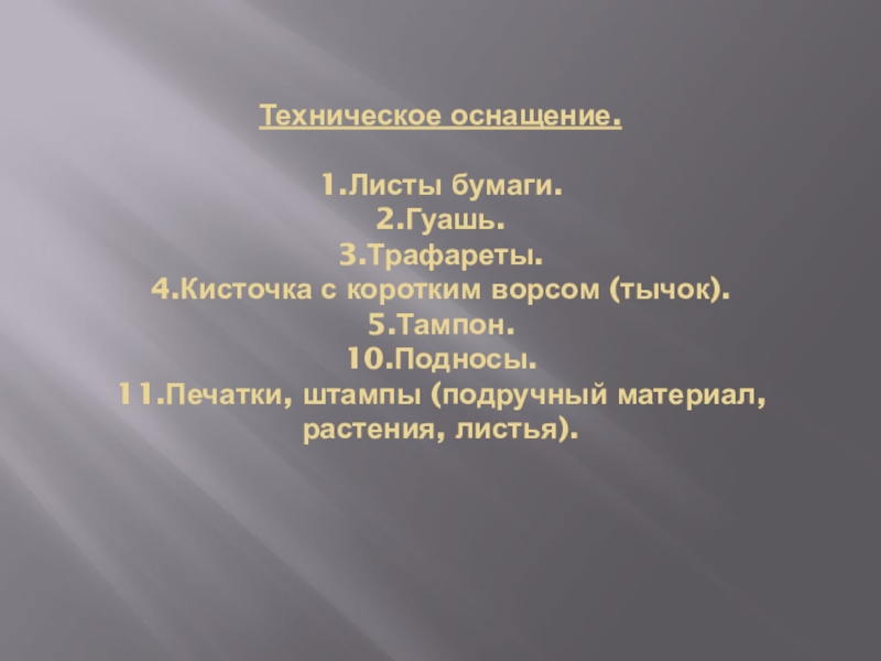 Слайд 6Техническое оснащение.   1.Листы бумаги. 2.Гуашь. 3.Трафареты. 4.Кисточка с коротким ворсом (тычок). 5.Тампон. 10.Подносы. 11.Печатки, штампы (подручный материал, растения,