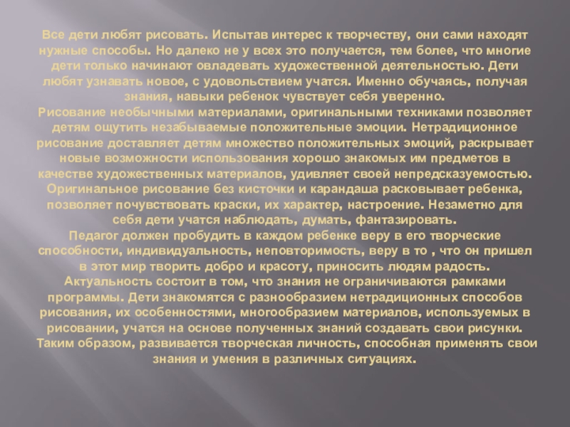 нужные способы. Но далеко не у всех это получается, тем более, что многие дети только начинают овладевать художественной деятельностью. Дети любят узнавать новое, с удовольствием учатся. Именно обучаясь, получая знания, навыки ребенок чувствует себя уверенно. Рисование необычными материалами, оригинальными техниками позволяет детям ощутить незабываемые положительные эмоции. Нетрадиционное рисование доставляет детям множество положительных эмоций, раскрывает новые возможности использования хорошо знакомых им предметов в качестве художественных материалов, удивляет своей непредсказуемостью. Оригинальное рисование без кисточки и карандаша расковывает ребенка, позволяет почувствовать краски, их характер, настроение. Незаметно для себя дети учатся наблюдать, думать, фантазировать. Педагог должен пробудить в каждом ребенке веру в его творческие способности, индивидуальность, неповторимость, веру в то , что он пришел в этот мир творить добро и красоту, приносить людям радость. Актуальность состоит в том, что знания не ограничиваются рамками программы. Дети знакомятся с разнообразием нетрадиционных способов рисования, их особенностями, многообразием материалов, используемых в рисовании, учатся на основе полученных знаний создавать свои рисунки. Таким образом, развивается творческая личность, способная применять свои знания и умения в различных ситуациях.