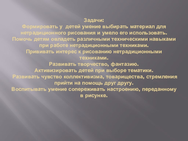 Слайд 4Задачи: Формировать у детей умение выбирать материал для нетрадиционного рисования и умело