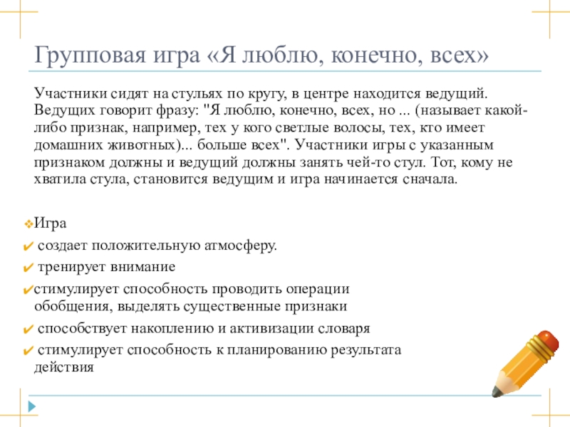 Слайд 10Групповая игра «Я люблю, конечно, всех»