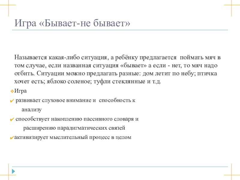 том случае, если названная ситуация «бывает» а если - нет, то мяч надо отбить. Ситуации можно предлагать разные: дом летит по небу; птичка хочет есть; яблоко соленое; туфли стеклянные и т.д.