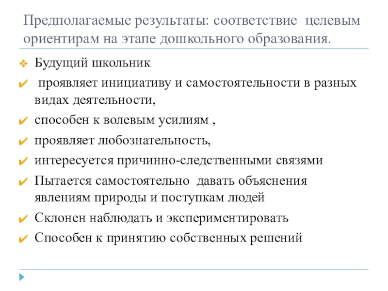 Слайд 13Предполагаемые результаты: соответствие целевым ориентирам на этапе дошкольного образования.