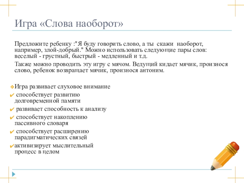 Также можно проводить эту игру с мячом. Ведущий кидает мячик, произнося слово, ребенок возвращает мячик, произнося антоним.