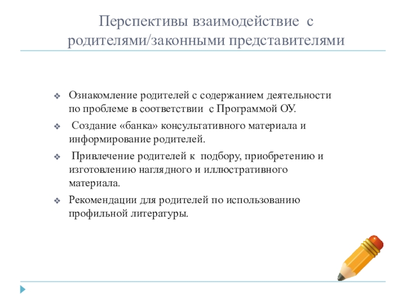 Слайд 7Перспективы взаимодействие с родителями/законными представителями