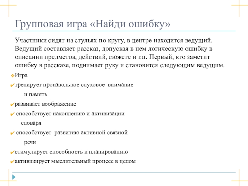 находится ведущий. Ведущий составляет рассказ, допуская в нем логическую ошибку в описании предметов, действий, сюжете и т.п. Первый, кто заметит ошибку в рассказе, поднимает руку и становится следующим ведущим.