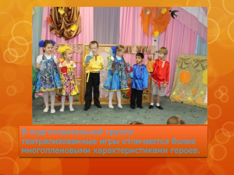 Слайд 8В подготовительной группе театрализованные игры отличаются более многоплановыми характеристиками героев.