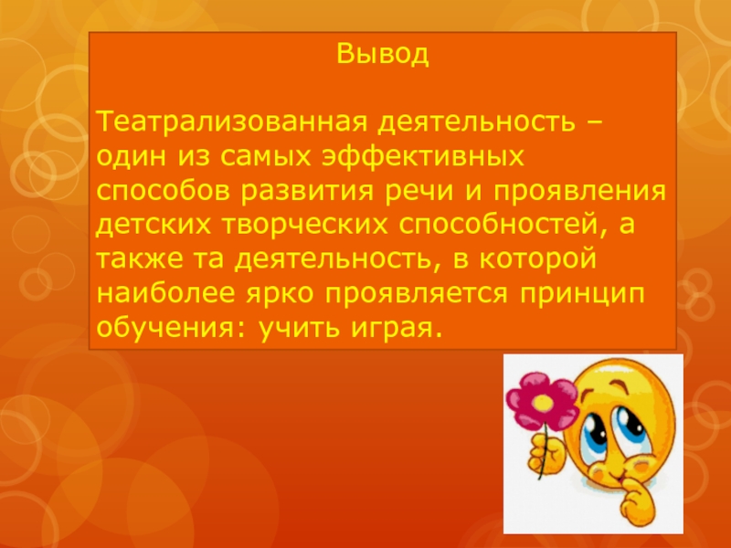 ВыводТеатрализованная деятельность – один из самых эффективных способов развития речи и проявления детских творческих способностей, а также