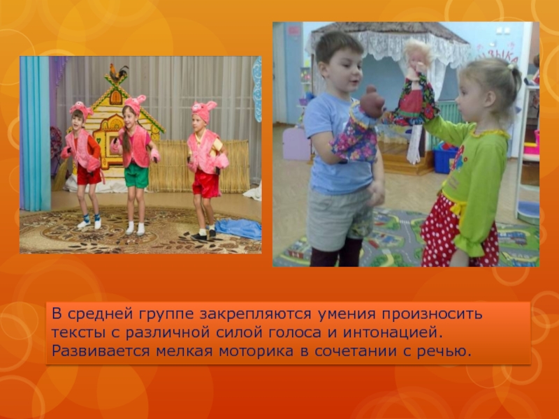 В средней группе закрепляются умения произносить тексты с различной силой голоса и интонацией. Развивается мелкая моторика в
