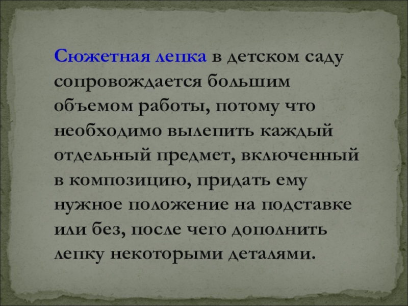Слайд 6Сюжетная лепка в детском саду сопровождается большим объемом работы, потому что