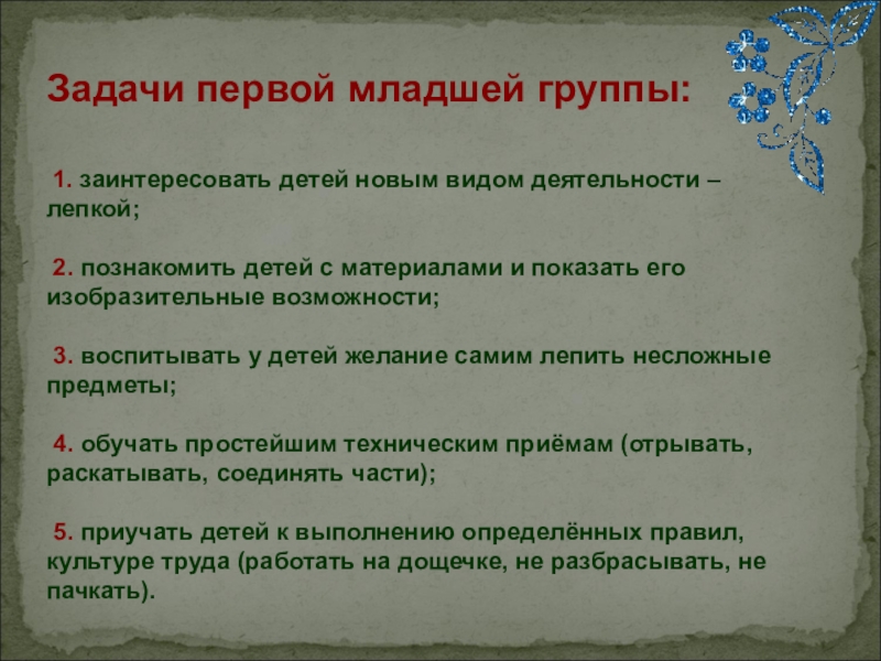 5. приучать детей к выполнению определённых правил, культуре труда (работать на дощечке, не разбрасывать, не пачкать).