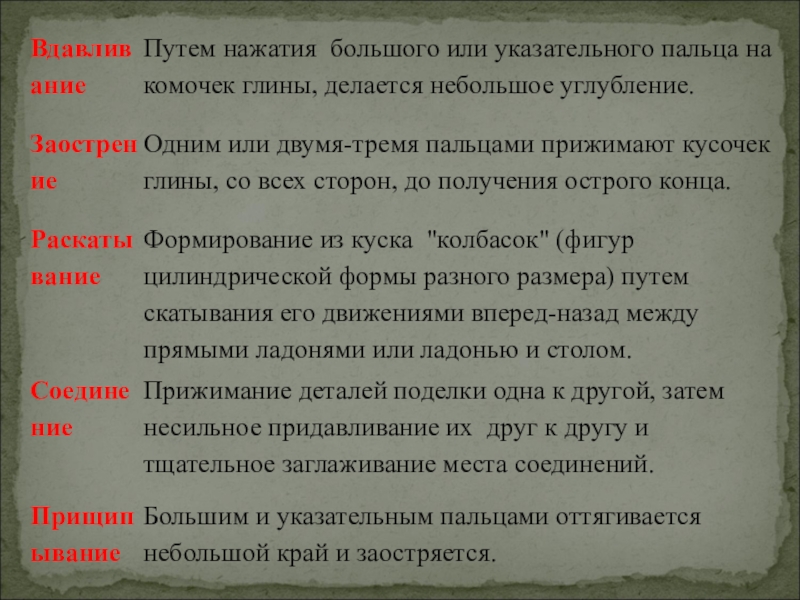 3. Учить лепить посуду разными способами (ленточный, круговой наклёп, выбирание глины);