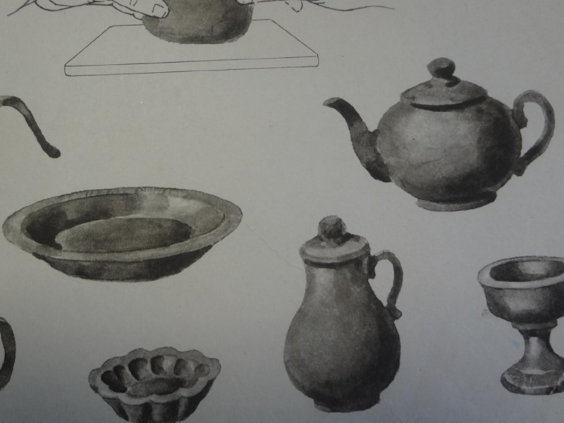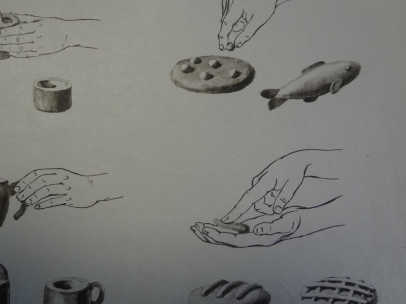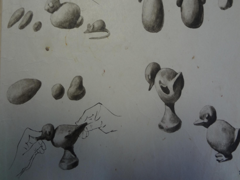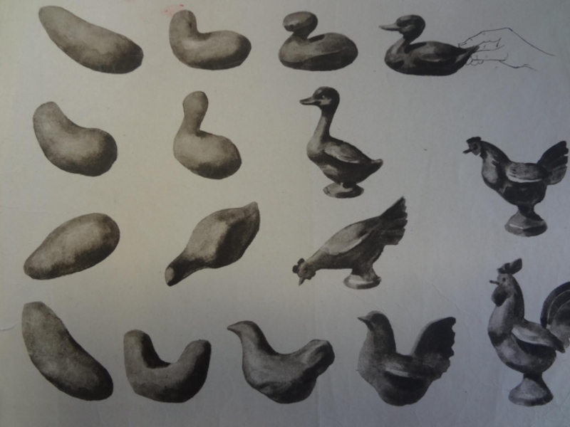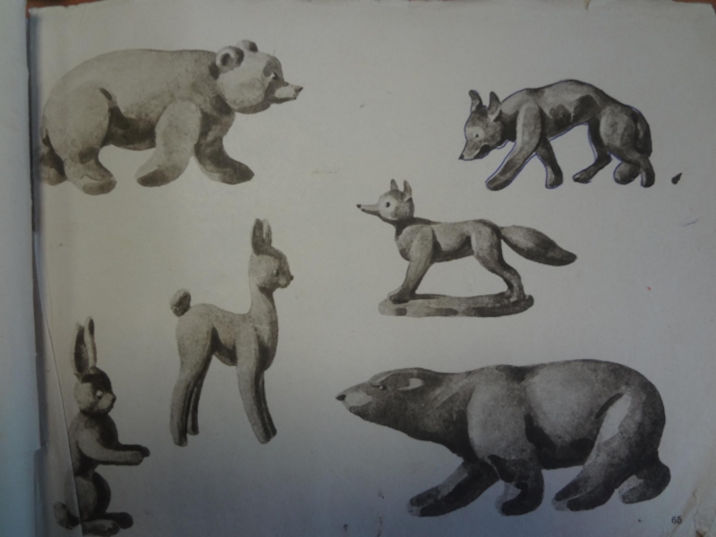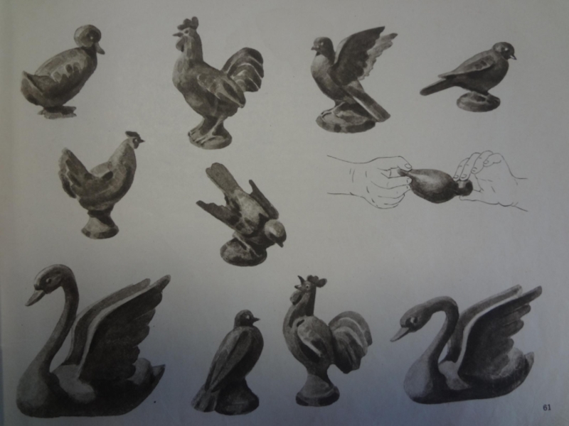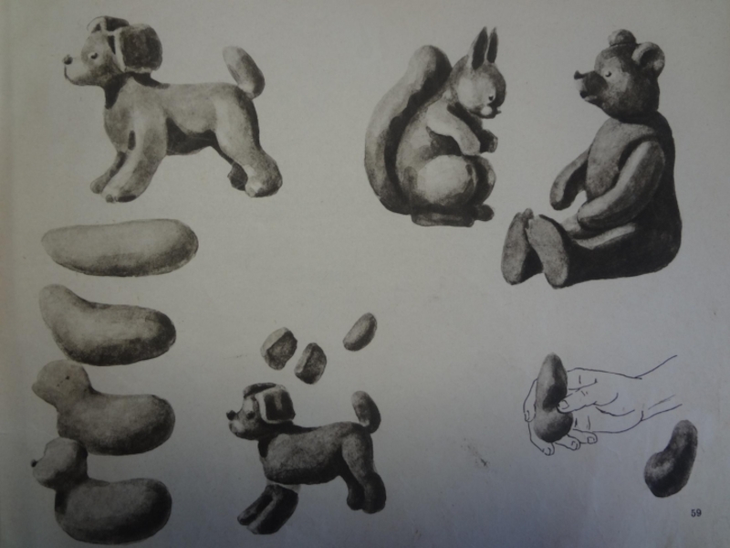 необходимо вылепить каждый отдельный предмет, включенный в композицию, придать ему нужное положение на подставке или без, после чего дополнить лепку некоторыми деталями.