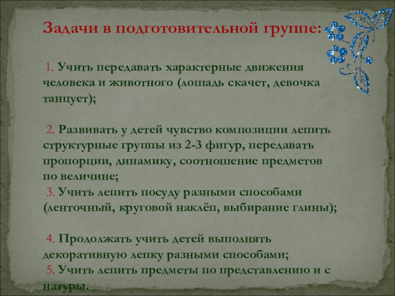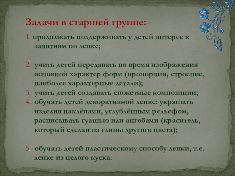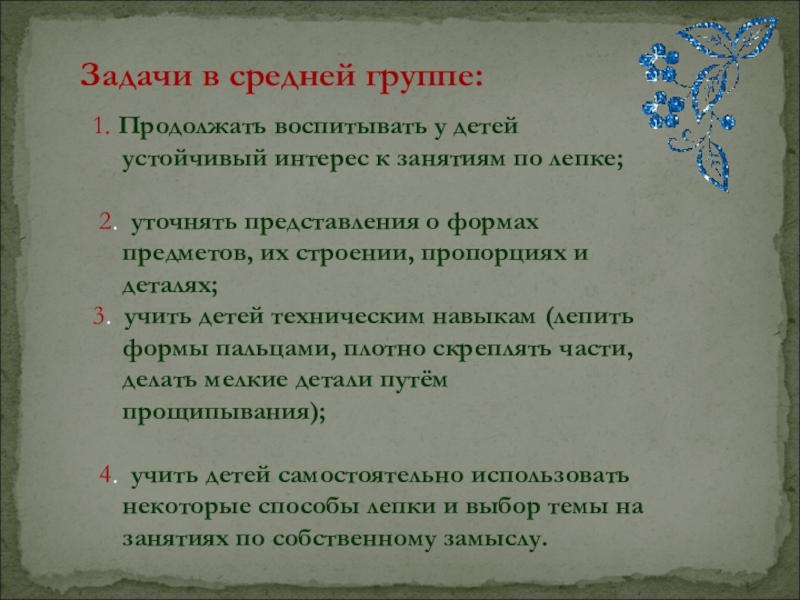 4. Продолжать учить детей выполнять декоративную лепку разными способами;