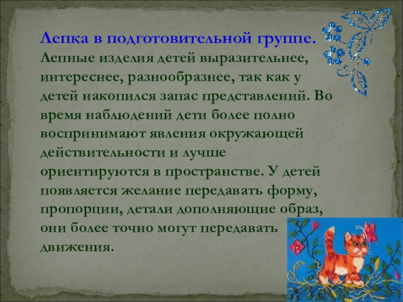 Слайд 19Лепка в подготовительной группе. Лепные изделия детей выразительнее, интереснее, разнообразнее, так