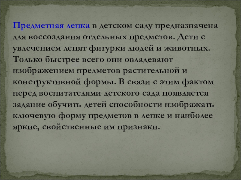 Слайд 5Предметная лепка в детском саду предназначена для воссоздания отдельных предметов. Дети