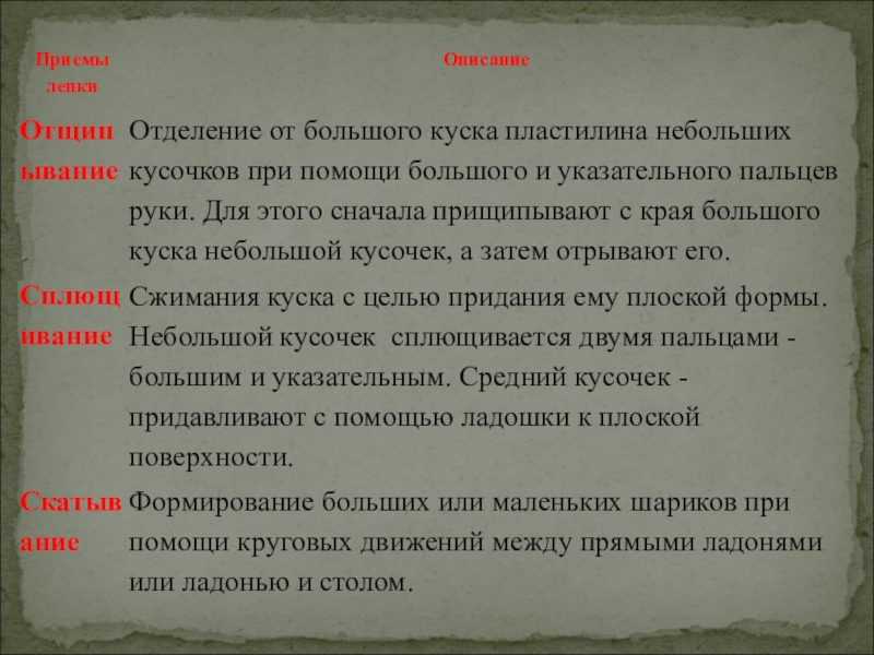 4. обучать простейшим техническим приёмам (отрывать, раскатывать, соединять части);