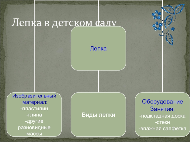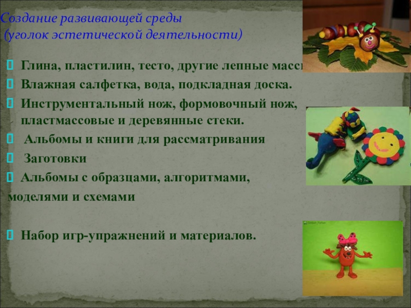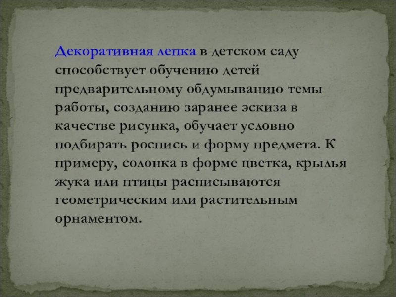 Слайд 7Декоративная лепка в детском саду способствует обучению детей предварительному обдумыванию темы