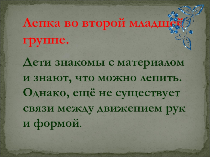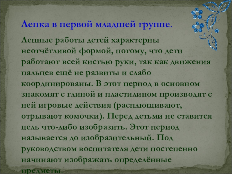 потому, что дети работают всей кистью руки, так как движения пальцев ещё не развиты и слабо координированы. В этот период в основном знакомят с глиной и пластилином производят с ней игровые действия (расплющивают, отрывают комочки). Перед детьми не ставится цель что-либо изобразить. Этот период называется до изобразительный. Под руководством воспитателя дети постепенно начинают изображать определённые предметы.