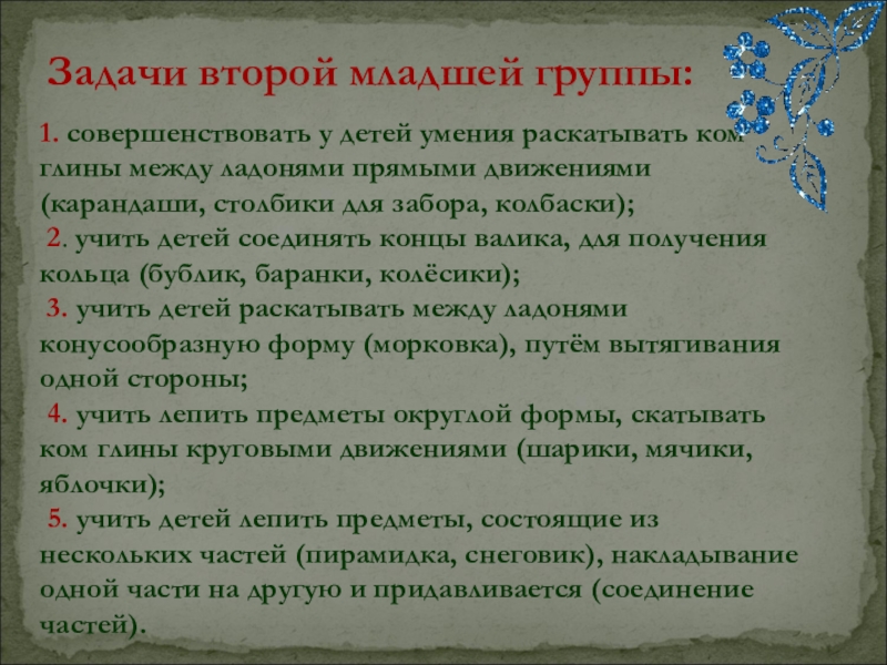 Слайд 141. совершенствовать у детей умения раскатывать ком глины между ладонями прямыми