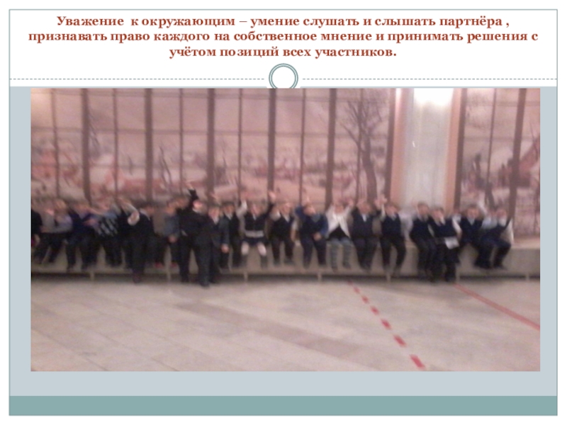 Слайд 16Уважение к окружающим – умение слушать и слышать партнёра ,признавать право