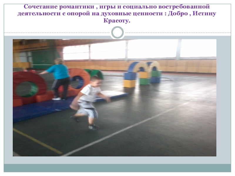 Сочетание романтики , игры и социально востребованной деятельности с опорой на духовные ценности : Добро , Истину