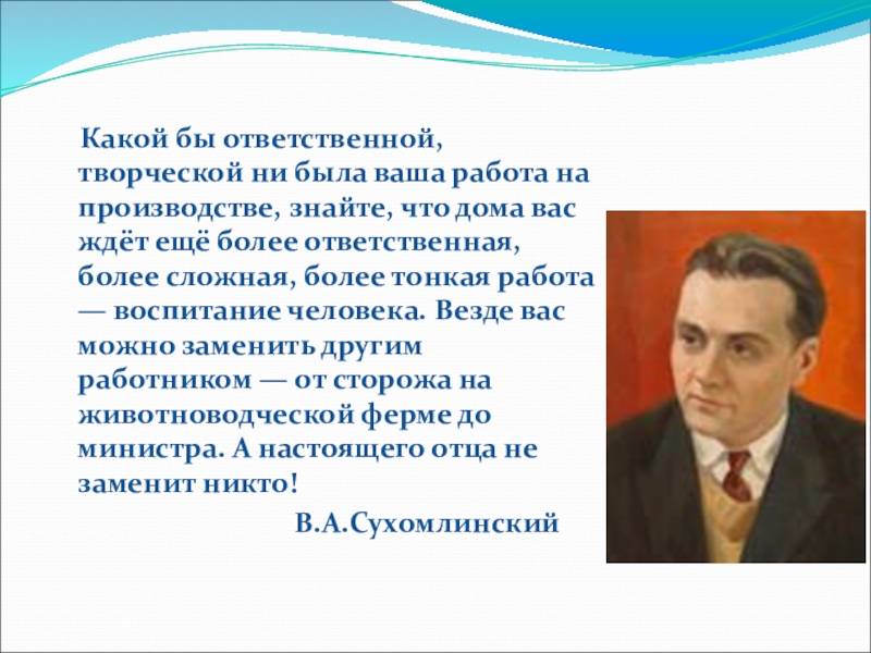 производстве, знайте, что дома вас ждёт ещё более ответственная, более сложная, более тонкая работа — воспитание человека. Везде вас можно заменить другим работником — от сторожа на животноводческой ферме до министра. А настоящего отца не заменит никто!