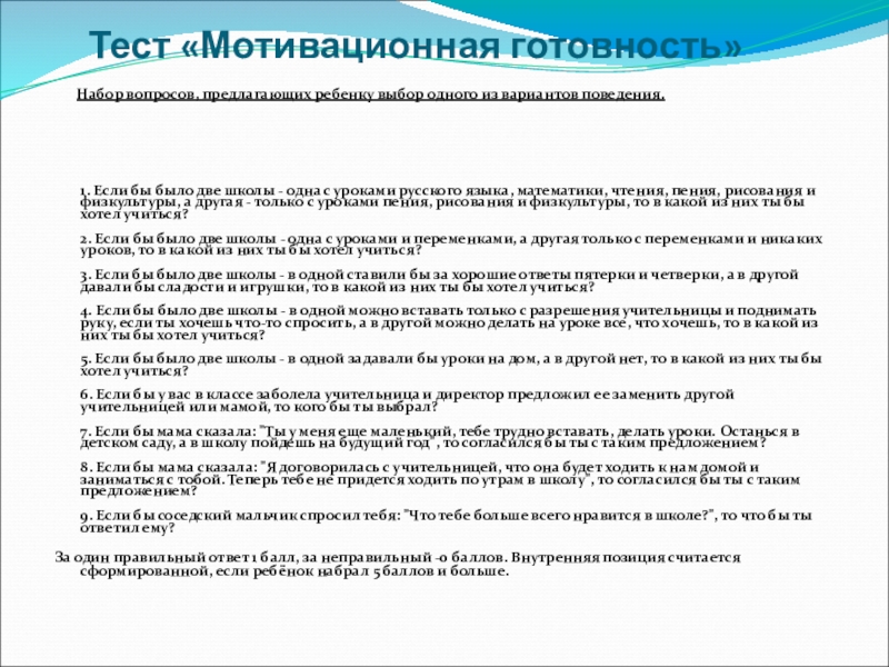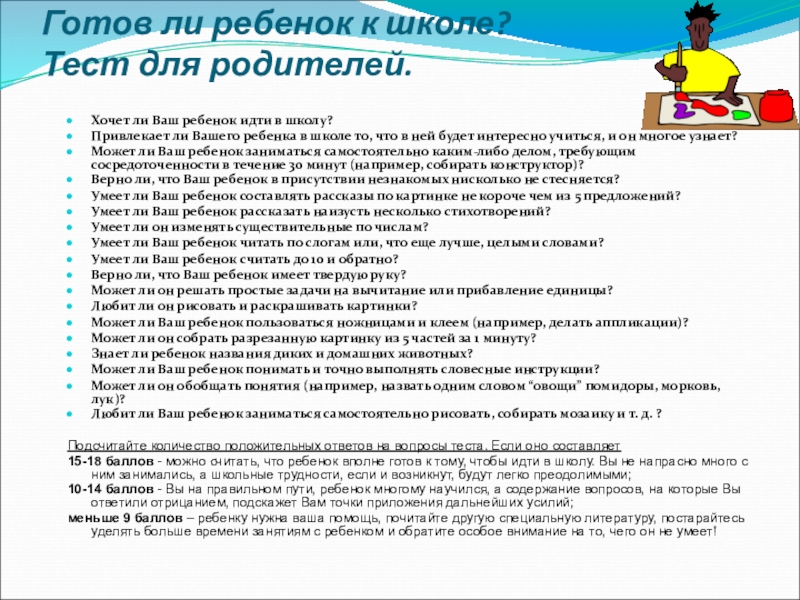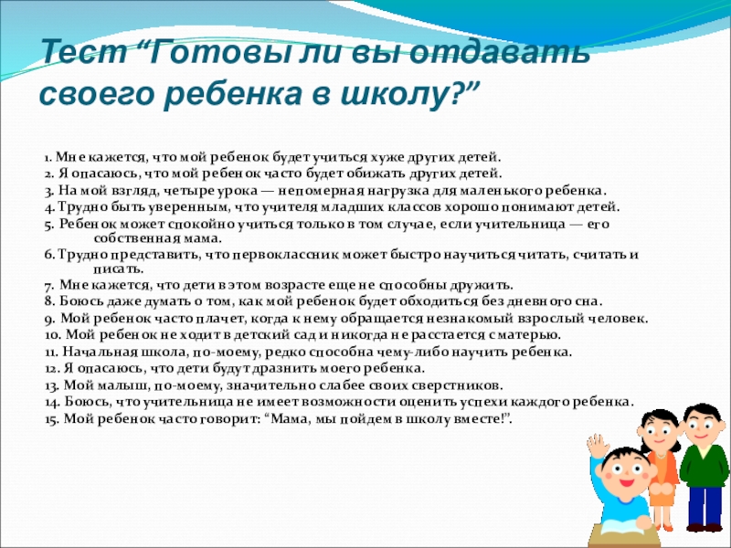 Слайд 3Тест “Готовы ли вы отдавать своего ребенка в школу?”