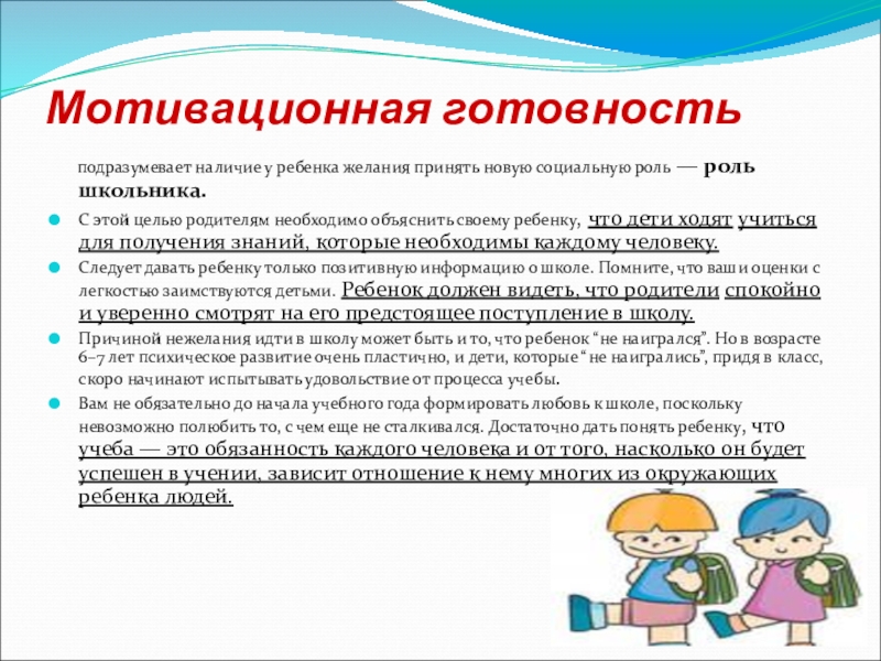 С этой целью родителям необходимо объяснить своему ребенку, что дети ходят учиться для получения знаний, которые необходимы каждому человеку.