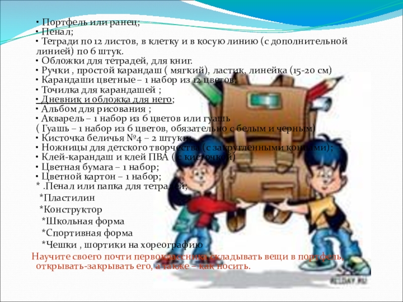 Слайд 11Завтра ты идешь в школу, давай сложим в портфель те предметы,