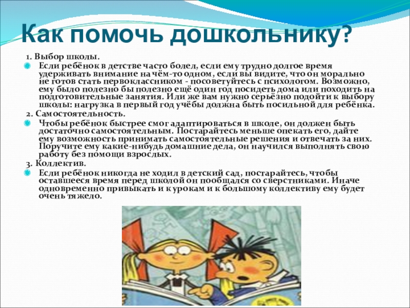 Чтобы ребёнок быстрее смог адаптироваться в школе, он должен быть достаточно самостоятельным. Постарайтесь меньше опекать его, дайте ему возможность принимать самостоятельные решения и отвечать за них. Поручите ему какие-нибудь домашние дела, он научился выполнять свою работу без помощи взрослых.