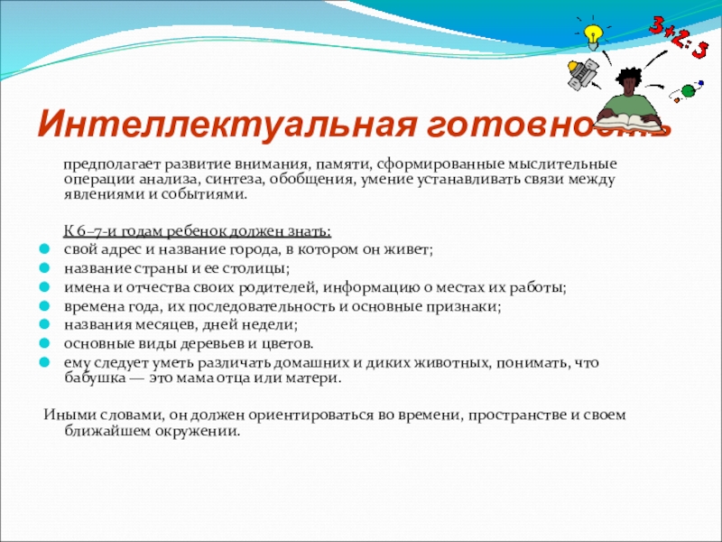 предполагает развитие внимания, памяти, сформированные мыслительные операции