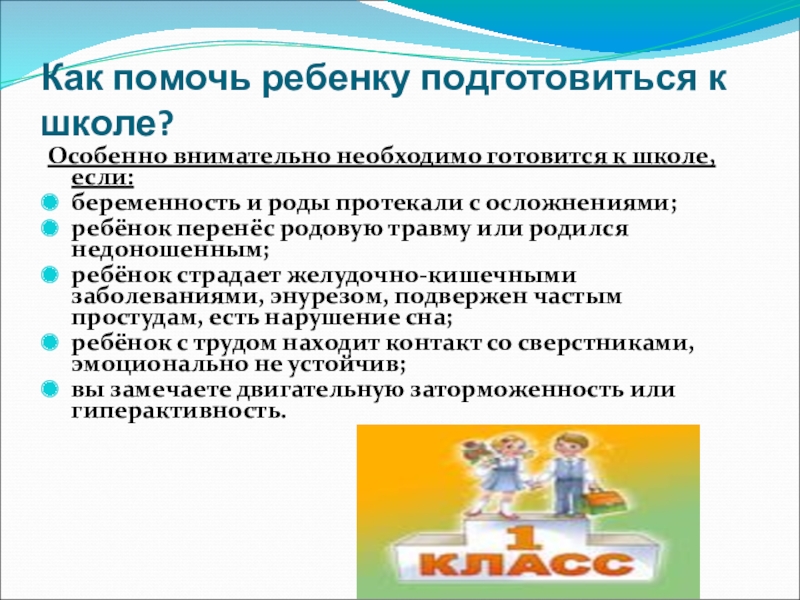 если ему трудно долгое время удерживать внимание на чём-то одном, если вы видите, что он морально не готов стать первоклассником - посоветуйтесь с психологом. Возможно, ему было полезно бы полезно ещё один год посидеть дома или походить на подготовительные занятия. Или же вам нужно серьёзно подойти к выбору школы: нагрузка в первый год учёбы должна быть посильной для ребёнка.