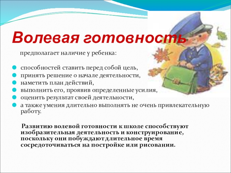 Развитию волевой готовности к школе способствуют изобразительная деятельность и конструирование, поскольку они побуждают длительное время сосредоточиваться на постройке или рисовании.