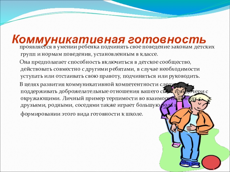 Она предполагает способность включиться в детское сообщество, действовать совместно с другими ребятами, в случае необходимости уступать или отстаивать свою правоту, подчиняться или руководить.
